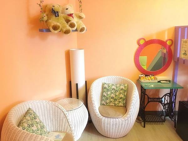 房間的一隅還有盪鞦韆小熊及古早縫紉台改裝的桌子