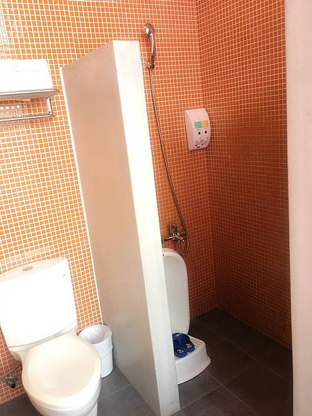 而且洗澡的地方與馬桶也僅有一道小牆隔開,並未有乾溼分離的設計