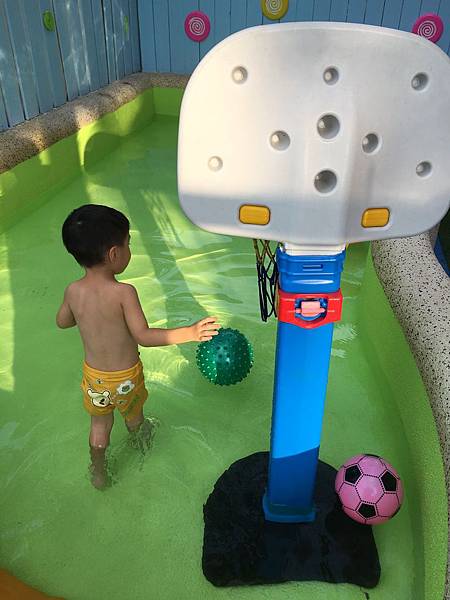 泳池上備有籃框與各種球球,可以一邊玩水一邊玩球