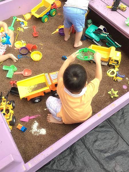 沙坑內原本就有許多工程車玩具,不用另外再帶來了