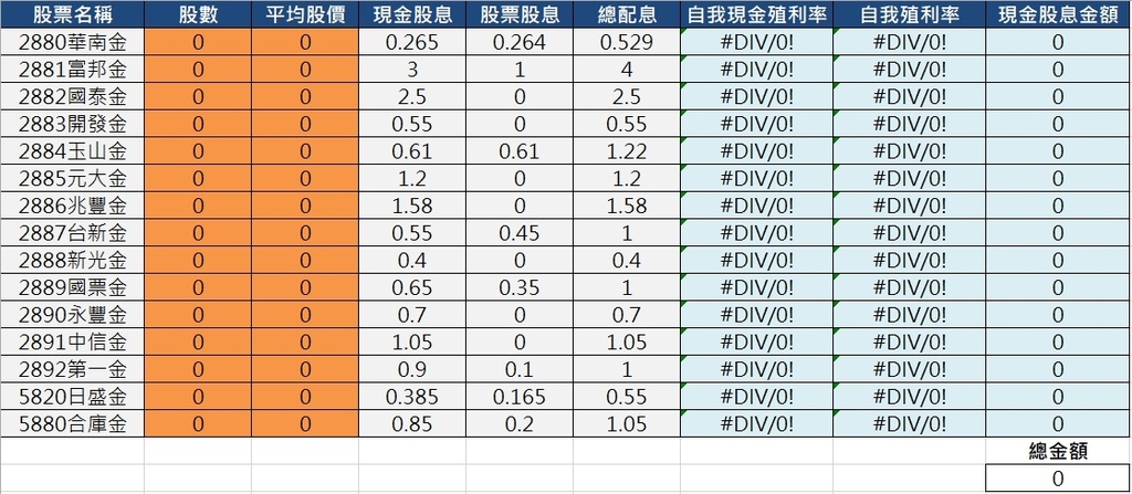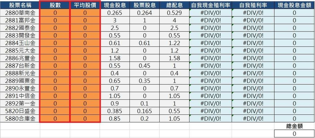 這邊安弟爸幫大家設計一個幫忙算今年金控股的自我殖利率Excel表,只要輸入「股數」及「平均價位」,就可以幫你算出今年的「自我現金殖利率」、「自我殖利率」、「現金股息金額」與所有股息的加總。自我殖利率Excel檔案的下載處:--->下載傳送門<---