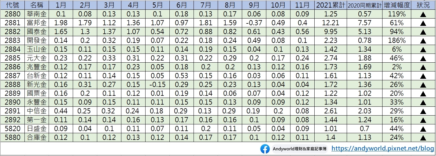 今年的金控公司的變化不小,也很多黑馬出現,所以平時關注多多關注業績,等下個月全年度預估的EPS出來,再進行更準確的股息預測,我想會比較接近事實。這篇我們一樣關注15家金控公司前11個月的發展,資料中可以發現,今年雖然金控都發展的不錯,但是資本市場非常重視成長率及未來的發展性,而今年各家的成長性卻相差非常大,至於是要汰弱留強抑或堅持自己所選,就尊重大家自己的意願了。